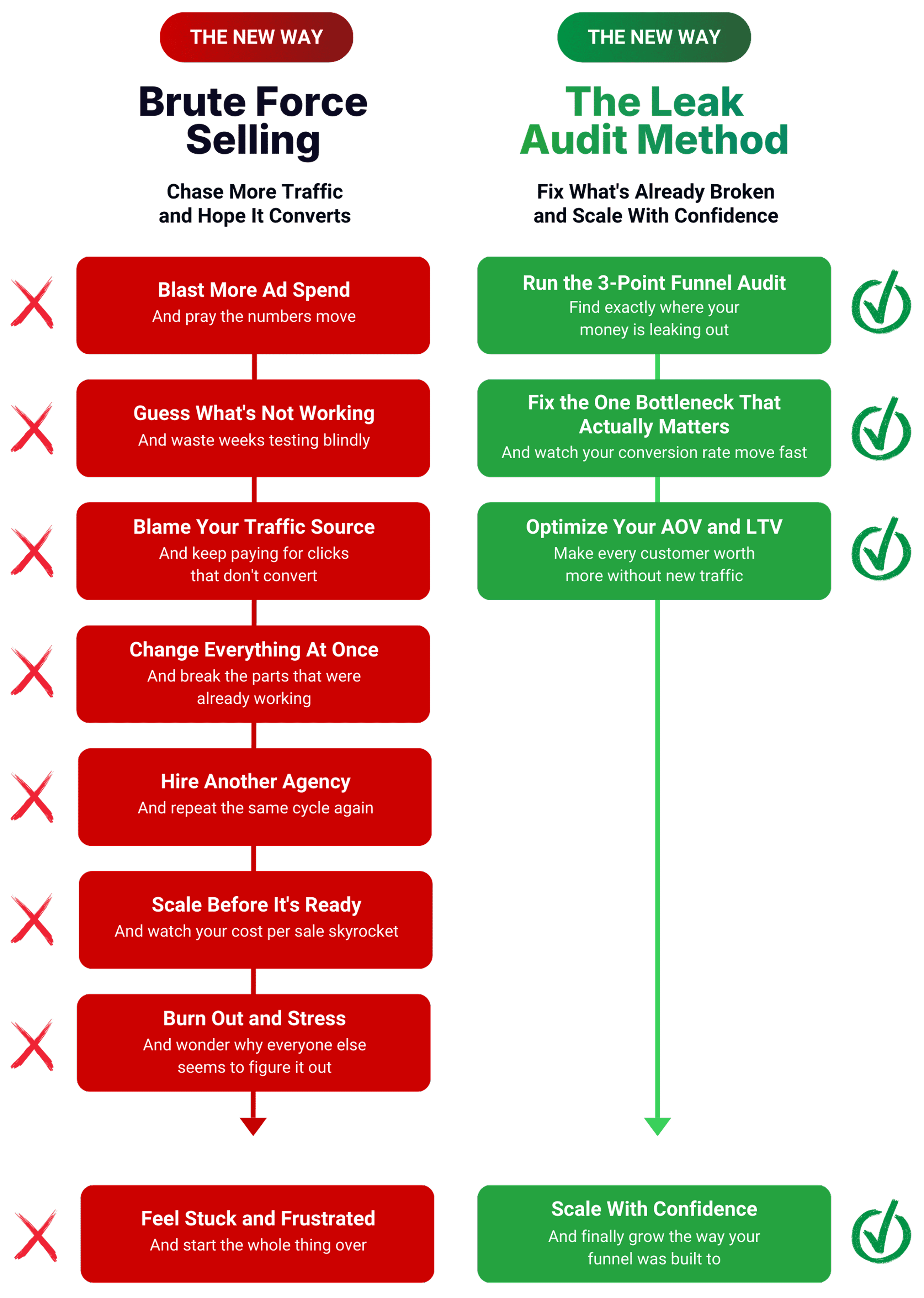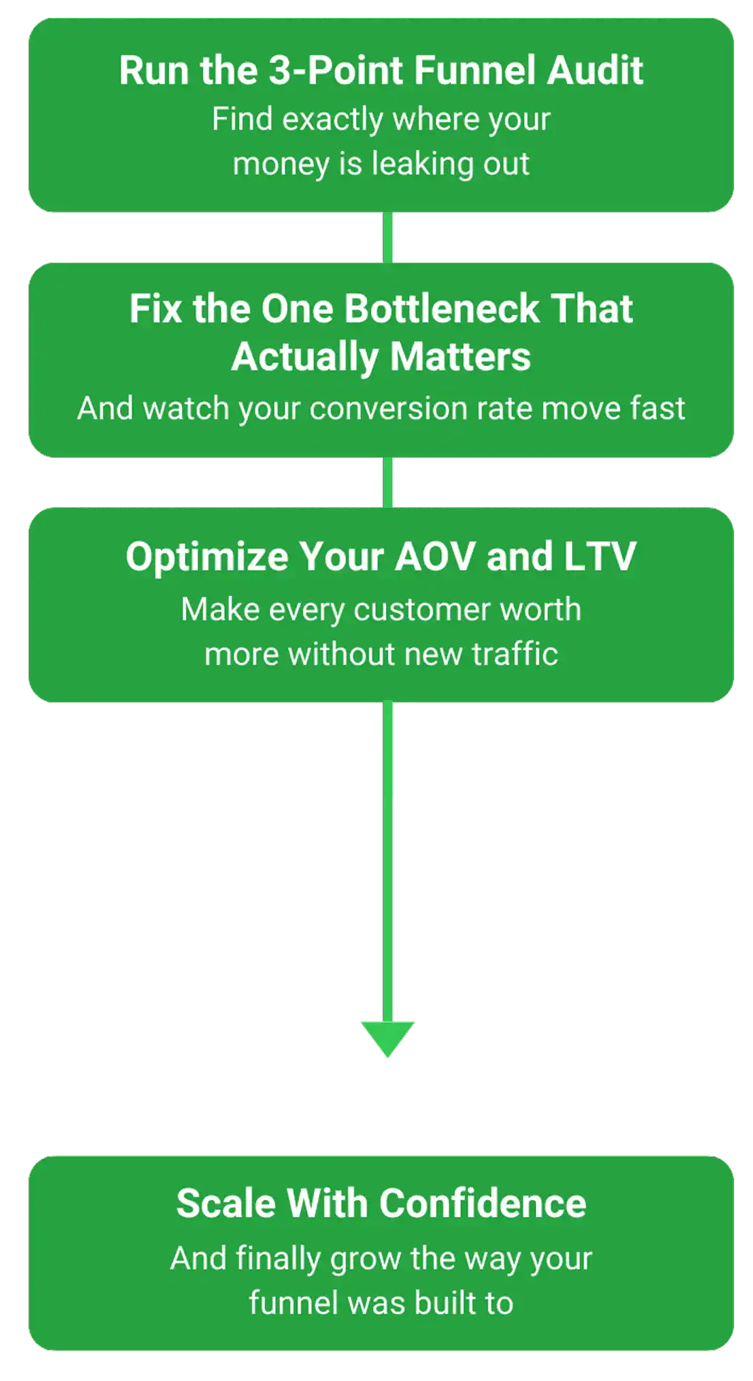 We achieve this by reverse engineering where your funnel is actually bleeding money and giving you a precise roadmap to plug those holes without guessing, without wasting ad spend, and without throwing more traffic at a broken system.